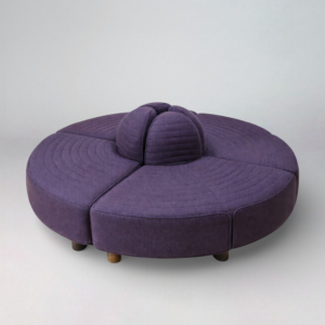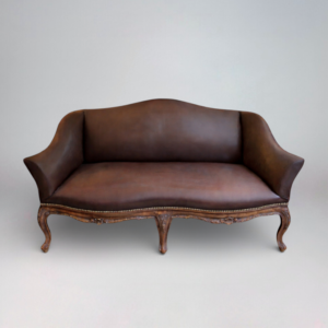 Canapé convertible en placage palissandre, cuir noir capitonné, dossier coussins cylindriques